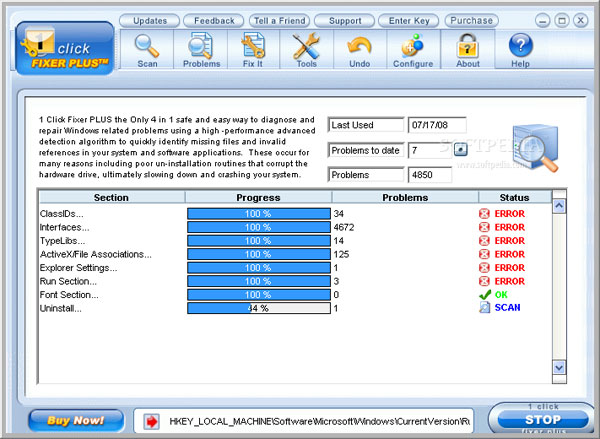 Cách sử dụng chương trình rất đơn giản, sau khi khởi động xong, bạn hãy click ngay nút START ở góc dưới bên phải cửa sổ của nó. Chỉ sau vài chục giây (tuỳ theo cấu hình máy), nó sẽ quét toàn bộ hệ thống và đưa ra những mục bị lỗi nếu có (bạn có thể xem cột Status để biết tình trạng).