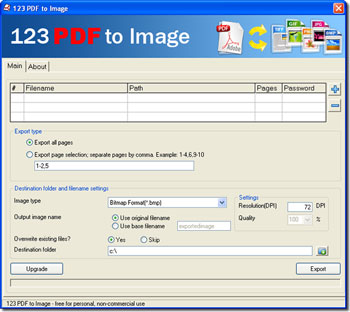 123 PDF to Imagelà một công cụ chuyển đổi PDF sang hình ảnh tiện dụng được thiết kế giúp người dùng chuyển các tập tin PDF thành hình ảnh với nhiều định dạng chỉ với 3 bước: chọn tập tin PDF, lựa chọn các thiết đặt, nhấp vào nút "Convert". Chương trình có thể xuất các trang PDF thành ảnh BMP, JPEG, JPG, GIF, PNG, WMF, EMF, làm việc với các tài liệu được mã hóa, xuất tất cả các trang hoặc chỉ một phần nhỏ.
