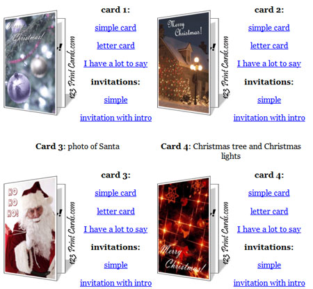 Trang web có 38 kiểu thiệp khác nhau, nhiều màu sắc, được vẽ rất độc đáo và tuyệt đẹp. Ngoài ra, trên trang web này còn có một đường link tới một trang khác, cho phép bạn thêm ảnh vào một trong tám mẫu thiệp Giáng Sinh, bao gồm hình ảnh của ông già Noel, bông tuyết, người tuyết, cây Giáng Sinh, đồ trang trí, cảnh mùa đông, và nhiều hơn nữa. Kích thước của các tấm thiệp này là 5 × 7, chúng không chỉ được dùng làm thiệp mừng Giáng Sinh mà còn có thể dùng như là thiệp cá nhân, hay trong những dịp đặc biệt khác.