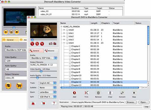 3herosoft DVD to BlackBerry Converter for Mac có thể chuyển đổi DVD sang định dạng video như AVI, 3GP, MP4, WMV và định dạng audio MP3, AAC, WMA với chất lượng video và audio tuyệt vời. Với phần mềm chuyển đổi này, các file video và audio đầu ra có thể chạy tốt trên thiết bị BlackBerry 8800, BlackBerry 8830, BlackBerry 8820, BlackBerry Pearl 8800, BlackBerry Curve 8300,...