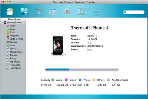 3herosoft iPhone to Computer Transfer for Mac cũng là công cụ quản lý iPhone tuyệt vời. Với phần mềm này, bạn có thể tìm duyệt thông tin, sắp xếp danh sách chơi nhạc và bộ sưu tập đa phương tiện trên iPhone, ví như tạo danh sách chơi nhạc mới, xóa nhạc. Phần mềm này hỗ trợ tất cả các mẫu iPhone/iPod/iPad, bao gồm iPad, iPad 2, iPhone 3G, iPhone 3GS, iPhone 4, iPod classic, iPod nano, iPod nano 5G, iPod nano 6G, iPod touch, iPod touch 4,...