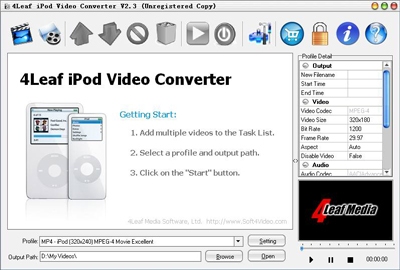 4Leaf iPod Video Converter là một công cụ chuyển đổi video hay nhất trên thế giới, chương trình có thể chuyển đổi video chuyển đổi tập tin của tất cả các định dạng phổ biến như AVI, MPEG, MPG, WMV, Xvid, Divx , ASF, MOV, VOB,... cho iPod video (MP4, H.264) với tốc độ tuyệt vời. Bạn cũng có thể trích xuất một loạt lựa chọn ra từ video. Hơn nữa, 4Leaf iPod Video Converter bao gồm chuyển đổi các tùy chọn phong phú như video chiều rộng, chiều cao của video, Bitrate của video và nhiều hơn nữa.