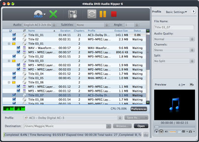 4Media DVD Audio Ripper for Mac có thể rip DVD sang hầu hết các định dạng âm thanh phổ biến với chất lượng âm thanh tuyệt vời. Bạn có thể nhanh chóng rip DVD sang MP3, WMA, WAV, M4A, AAC, AC3, OGG,... và chơi trực tiếp trên các thiết bị kỹ thuật số phổ biến khác.