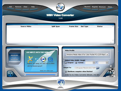 A-Z WMV Video Converter là một chương trình mạnh mẽ và là một công cụ tuyệt vời để chuyển đổi các định dạng video như AVI DIVX sang WMV ASF, RM RMVB sang WMV ASF, MOV sang WMV ASF, MPEG VCD DVD sang WMV ASF.
