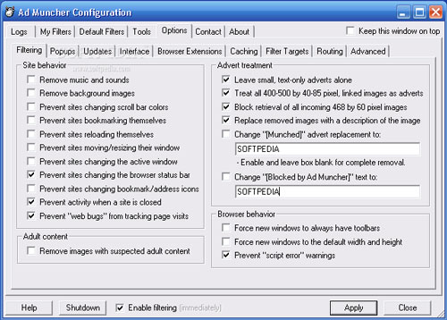 Vũ khí bí mật mà tôi thường sử dụng để chặn quảng cáo đó chính là Ad Muncher 4.91, đây là một trong những công cụ chặn pop-up hiệu quả nhất và dễ sử dụng nhất. Cứ cho là Ad Muncher sẽ yêu cầu bạn trả 30USD sau 30 ngày dùng miễn phí, nhưng tôi đảm bảo với bạn rằng Ad Muncher sẽ ngăn được 98% banner, flash, các cửa sổ pop-up, các quảng cáo trượt và quảng cáo chữ. Ad Muncher cũng có những đặc tính hữu ích khác, như một tường lửa nặc danh che giấu bạn khi lướt web.