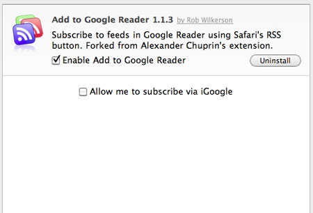 Tiện ích mở rộng này của Rob Wilkerson có khả năng thực hiện đúng như tên gọi của nó: Thêm RSS feed của trang hiện tại vào tài khoản Google Reader của bạn thông qua các nút trên thanh công cụ.