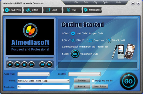 Aimediasoft DVD to Nokia Converter là phần mềm chuyển đổi chuyên nghiệp, có thể chuyển đổi DVD sang định dạng video MP4, 3GP, cùng với chức năng trích xuất phim DVD sang định dạng MP3, AAC, WAV dành cho điện thoại Nokia. Video sau khi được chuyển đổi tương thích với các thiết bị như Nokia N96, Nokia E75, Nokia E71, Nokia E63, Nokia N95, Nokia N75, Nokia N97,...