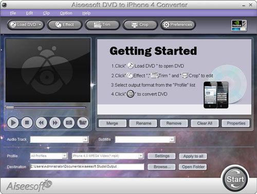 Bạn có chiếc iPhone 4 mới mua? Bạn muốn thưởng thức các bộ phim DVD yêu thích trên thiết bị này? Nếu vậy, hãy sử dụng phần mềm Aiseesoft DVD to iPhone 4 Converter. Với các chức năng chuyển đổi và chỉnh sửa mạnh mẽ, bạn có thể dễ dàng chuyển đổi đĩa DVD sang bất kì định dạng nào tương thích với iPhone 4, và thoải mái chỉnh sửa đĩa phim DVD nhằm tạo video theo nhu cầu.