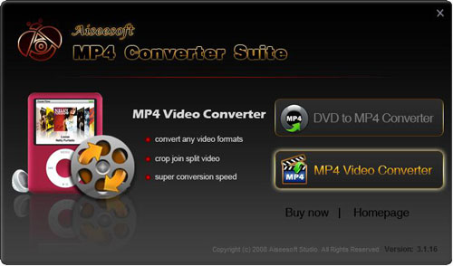 Aiseesoft MP4 Converter Suite là sự kết hợp hoàn hảo của Aiseesoft DVD to MP4 Converter và Aiseesoft MP4 Video Converter, vậy nên nó rất mạnh mẽ và dễ sử dụng để chuyển đổi DVD và tất cả các định dạng video/audio sang MP4, AVI, M4A, MP3, AAC dành cho tất cả các thiết bị MP4 phổ biến, ví như iPod, iPod touch, iPhone 4, iPad 2, PSP, Creative Zen, Zune, Zune 2, iRiver PMP, Archos, PS3, Xbox,... Thêm vào đó, phần mềm này còn có thể trích xuất audio từ đĩa DVD hoặc các file video sang định dạng audio MP3, AAC, M4A.