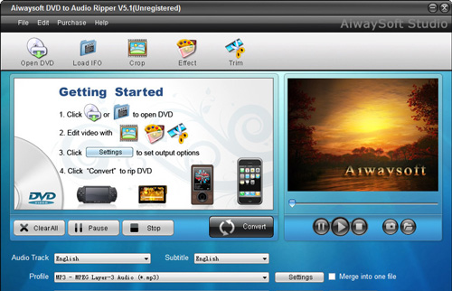 Aiwaysoft DVD to Audio Converter là phần mềm rip DVD sang MP3 và trích xuất DVD audio chuyên nghiệp, có thể rip DVD audio sang hầu hết các định dạng audio phổ biến như MP2, MP3, AAC, M4A, AC3, WMA, OGG, RA và AMR. Phần mềm trích xuất audio tốt nhất này có thể chuyển đổi DVD sang MP3 với tốc độ rip rất nhanh cùng rất nhiều chức năng chỉnh sửa mạnh mẽ, để bạn có thể tận hưởng nhạc trên tất cả các máy nghe nhạc MP3 và MP4 phổ biến như iPod nano, iPod shuffle, iPod Classic, Zune, PSP, iPhone, iRiver, Archos, Creative Zen,....