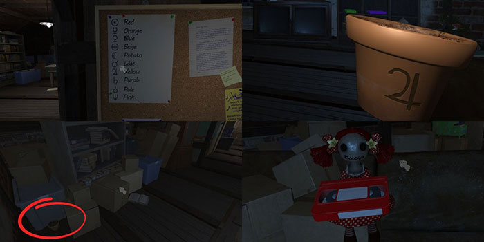 Người chơi chỉ có thể lấy cuộn băng đỏ bằng cách đưa cho búp bê một bông hoa. Khi người chơi mang một trong nhiều cái chậu trên gác mái đến nơi có nước nhỏ giọt, một cái cây sẽ mọc ra từ cái chậu đó. Mảnh giấy bên trong két cho biết bông hoa màu gì sẽ mọc ra khỏi chậu khi được tưới nước. Có một cái được dán biểu tượng của sao Mộc, trông giống như số 4 cách điệu. Cái này chứa những bông hoa màu vàng cần thiết để tặng búp bê.