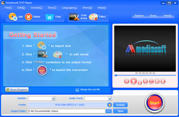 Chương trình có thể rip và chuyển DVD thành tập tin MP4, WMV, AVI hoặc trích âm thanh từ DVD thành MP3, WMA, OGG. Hơn nữa, bạn có thể sử dụng có thể được sử dụng như một trình biên tập đơn giản để chỉnh sửa video. Bạn có thể cắt các khung hình video, cắt đoạn video yêu thích, kết hợp nhiều video, thay đổi hiệu ứng và thêm hình mờ vào video đầu ra. Mọi tập tin được Amediasoft DVD Ripper chuyển đổi đều được hỗ trợ trên mọi máy nghe nhạc cầm tay như iPhone, iPod.