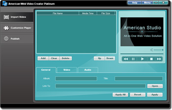American Web Video Creator có thể xuất bản bất kỳ video nào lên trang web hoặc blog với một trình chơi video cho web được tạo. Nó có thể chuyển đổi nhiều video khác nhau thành video Flash (chẳng hạn MOD, TOD, MP4, 3GP, AVI, MPEG, MKV, ASF sang FLV hoặc SWF), và sau đó đăng video Flash được chuyển đổi lên trang web hoặc blog. Sau đó bạn có thể chơi các video yêu thích của bạn trên web hoặc blog thông qua trình chơi video web và chia sẻ chúng với bạn bè trên Internet. American Web Video Creator này có nhiều tính năng mạnh mẽ có thể đáp ứng nhu cầu của người dùng. Bạn có thể điều chỉnh các thông số của tập tin đầu ra, tùy chỉnh màu nền và nút bấm của trình chơi với bảy chế độ màu được hỗ trợ.