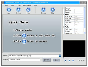 Amond AVI/WMV/MPEG/MOV/DIVX/FLV/XVID/MP3 Video Converter là phần mềm chuyển đổi file video và audio phổ biến, cho phép chuyển đổi qua lại giữa nhiều định dạng file như AVI, WMV, MPEG, MOV, DIVX, FLV, XVID, MP3.