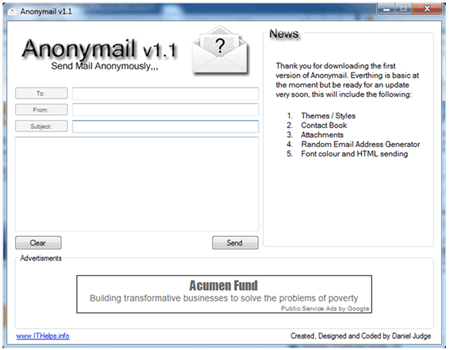 Bạn muốn gửi các email nặc danh với những địa chỉ email ảo để tránh những cỗ máy tìm kiếm địa chỉ email và tránh sự tấn công của thư rác. Vậy thì AnonyMail It! sẽ lả một lựa chọn hợp lý, đây là một công cụ nhỏ gọn và hoàn toàn miễn phí, không cần cài đặt. Cho phép người dùng dễ dàng gửi email nặc danh chỉ với vài cú kích chuột.
