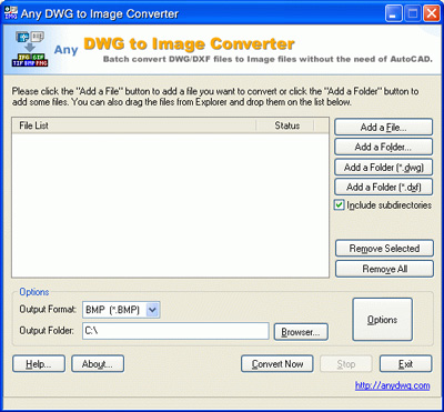 Bạn có thể dùng Any DWG to Image Converter để chuyển đổi file DWG hoặc DXF sang các định dạng ảnh phổ biến như TIFF, JPG, BMP, GIF, PNG, TGA, PCX, WMF, EMF để xem.