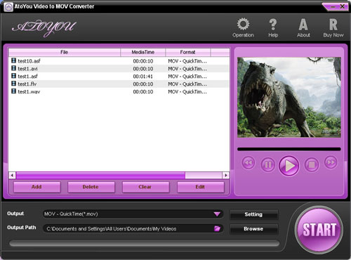 ATOYOU Video to MOV Converter có thể chuyển đổi gần như tất cả các định dạng video phổ biến như AVI, MPEG, WMV, MP4, FLV, MKV, H.264/MPEG-4, DivX, XviD, RM, RMVB, M4V, VOB, ASF, 3GP, 3G2, SWF, H.261, H.264, NSV sang định dạng MOV. Phần mềm này hỗ trợ chuyển đổi video HD với tốc độ thực hiện siêu nhanh. Người dùng có thể xem trước video trước khi chuyển đổi để có được chính xác phần mong muốn.