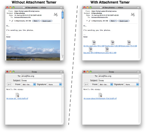 Attachment Tamer giúp bạn có thể quản lý các bản đính kèm trong Apple Mail. Ứng dụng này sẽ giúp bạn giải quyết các vấn đề gây khó chịu của Apple Mail, đảm bảo khả năng tương thích với phần mềm email khác, và cho phép bạn cài đặt cách hiển thị và gửi đi của các bản đính kèm.