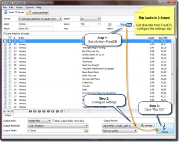 Việc sao chép các bài hát từ đĩa CD tương tự như chuyển đổi âm thanh, ngoại trừ người dùng có thể tìm kiếm thông tin CD trực tuyến trong cơ sở dữ liệu FreeDB. Nếu có, các thông tin CD được tải về vào chương trình. Thông tin này bao gồm các dữ liệu liên quan đến nghệ sĩ biểu diễn, album và tiêu đề bài hát.