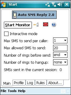 Trong giao diện của chương trình, bạn mở thẻ Main, đánh chọn Max SMS send per caller rồi chọn lượng tin nhắn mà bạn muốn chương trình tự gửi để thông báo bạn đang bận khi có người gọi đến. Max allowed SMS to send rồi chọn số tin nhắn tối đa gửi đi khi có tin nhắn đến. Number of rings before send và Number of rings to hangup để chương trình phát ra âm thanh hoặc rung máy báo hiệu trước khi gửi tin nhắn đi. Thiết lập xong, bạn nhấn nút Start Monitor để kích hoạt công cụ.