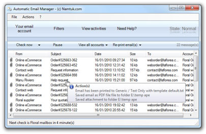 Automatic Email Manager sẽ tự động quản lý, theo dõi hộp thư điện tử, phát hiện các email mới của bạn và áp dụng các hành động xác định như in email hoặc file đính kèm (file như FAX, PDF, Word, Excel, hình ảnh, TIFF, ...), xóa email trên máy chủ, sao lưu và file đính kèm email trên đĩa, gửi thư trả lời tự động...