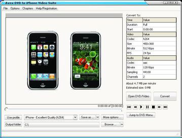 Avex DVD to iPhone Video Suite là chương trình để tạo các phim định dạng iPhone từ file DVD, chương trình TV và đầu video gia đình. Phần mềm này kết hợp chuyển đổi từ DVD sang iPhone và là trình chuyển đổi iPhone Video được “đóng gói” trong một gói dữ liệu.