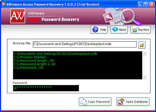 Phần mềm MS Access database password recovery là công cụ tiện ích để bạn lấy lại các mật khẩu file MBD đã mật hoặc quên. Phần mềm này có thể dễ dàng loại bỏ mật khẩu khỏi file có mật khẩu bảo vệ. Công cụ này hỗ trợ tất cả các phiên bản của cơ sở dữ liệu Access, bao gồm 2000, XP (2002) và 2003. Unlock Access MDB File chỉ là phần mềm đọc, không làm ảnh hưởng tới nội dung của cơ sở dữ liệu. Công cụ mở khóa mật khẩu này không tốn nhiều tiền của bạn, có giao diện thân thiện người dùng và có thể truy hồi ngay lập tức các ký tự mật khẩu.