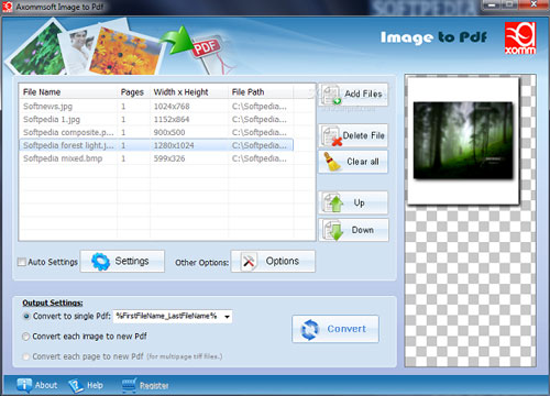 Phần mềm Axommsoft Image to Pdf converter là phần mềm nhanh, đáng tin cậy và rất dễ sử dụng, cho phép bạn chuyển đổi ảnh của dữ liệu được scan, ảnh của fax và các mẫu ảnh khác sang định dạng PDF. Phần mềm này hỗ trợ tất cả các định dạng ảnh phổ biến, ví như TIF, TIFF, JPEG, PNG, GIF, BMP, TGA, PGM, WMF, EMF, WBMP, ICO, PBM, PSD,PCX, DCX, DIB, RLE, PPM, PCD,... Đây là công cụ độc lập cho phép người dùng có thể đặt kích cỡ trang, kích cỡ ảnh, vị trí ảnh, xoay ảnh, lật ảnh (ngang và dọc), nén ảnh (giảm kích cỡ PDF đầu ra) và màu ảnh,... Các tính năng khác bao gồm khả năng bookmark PDF, bảo vệ PDF (Mật khẩu mở file và mật khẩu người sở hữu),...