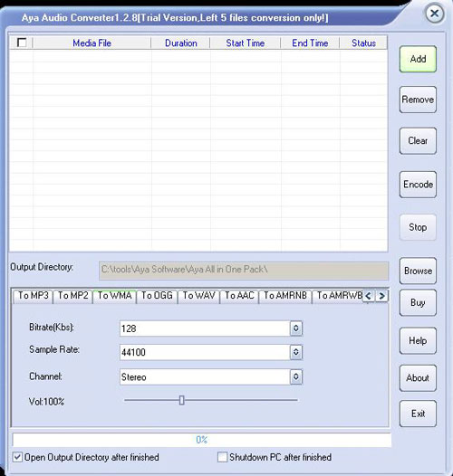 Aya Audio Converter cho phép bạn có thể trích xuất audio từ video và chuyển đổi các file audio giữa các định dạng WAV, OGG, MP3, MP2, WMA, AAC, M4A, AMR dựa theo nhu cầu của bạn. Điều quan trọng nhất là nó có thể trích xuất audio từ các nguồn yêu thích của bạn như YouTube, Google, hoặc Myspace. Aya Audio Converter hỗ trợ rất nhiều định dạng, ví như AVI, XVID, DIVX, WMV, ASF, ASX, MPEG1, MPEG2, DVD, SVCD, VCD, RM, RMVB, MOV, QT, FLV, SWF, MKV, OGM, MP4, 3GP, và 3GP2.