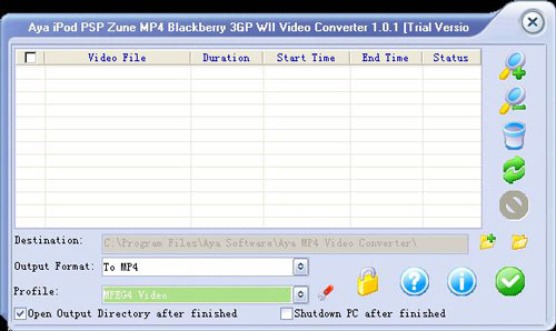 Aya iPod PSP Zune MP4 Blackberry 3GP Wii Video Converter cho phép bạn có thể chuyển đổi tất cả các định dạng video phổ biến hiện nay, bao gồm AVI (DivX, XviD, H.263, and H.264), DV AVI, MP4,WMV, 3GP, 3G2, MOV, SWF, VOB, VRO, MPEG, VCD, SVCD, ASF, ASX, MJPEG, Real Video (RM and RMVB), DVR-MS, MKV, OGM, và FLV. Người dùng có thể chuyển đổi video sang các định dạng dành cho DVD, iPod, iPhone, Apple TV, PSP, PS3, WII, Zune, Zen, Epson, iPaq PPC, PDA, và Blackberry. Bên cạnh đó, người dùng cũng có thể chuyển đổi các video yêu thích của mình, được download từ các trang web YouTube, Google Video, và Myspace.