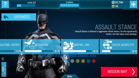 Nâng cấp Batman theo cách mà bạn muốn chơi. Game cung cấp hơn 250 phần nâng cấp, cho phép người chơi tập trung vào các kỹ năng có hiệu lực trong mọi thời điểm, sử dụng Assault Stance để di chuyển dạng tấn công, hoặc Guarded Stance để phòng thủ.