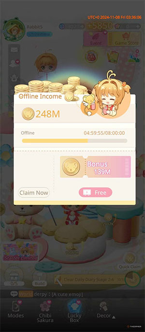 Tính năng Quick Claim còn giúp người chơi thu tất cả xu từ các Chibi Sakura chỉ bằng một lần chạm. Ngay cả khi thoát game, người chơi vẫn có thể thu được lượng xu rất lớn, miễn là đăng nhập lại sau mỗi 8 tiếng. Tuy nhiên, tiền sẽ không tích lũy vượt quá giới hạn này. Mọi người cũng nên mở ví xu mỗi giờ để nhận thêm xu Tomoeda tối đa 3 lần/ngày.