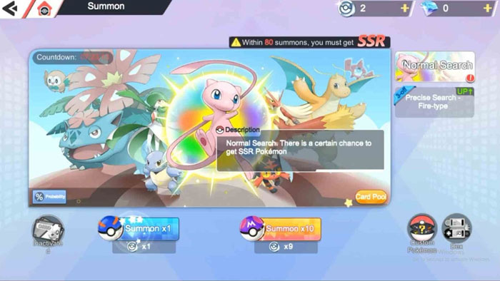 Hệ thống triệu hồi bao gồm các banner triệu hồi Pokémon bằng các loại tiền tệ gacha khác nhau. Khi có đủ các loại tiền tệ gacha cần thiết, người chơi nên sử dụng chúng để triệu hồi Pokémon mạnh nhất.