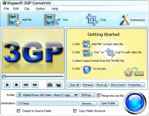 Bigasoft 3GP converter có thể thay đổi các bộ phim 3GP, MP4 để giúp bạn thưởng thức các bộ phim yêu thích trên điện thoại di động, PDA. Phần mềm này hỗ trợ rất nhiều thiết bị di động, ví như Samsung, Motorola, LG, BlackBerry, Nokia, Apple, HTC,...