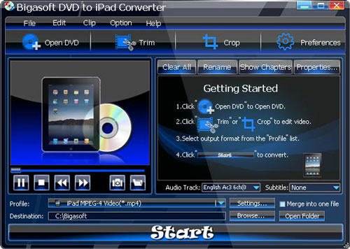 Bigasoft DVD to iPad Converter, phần mềm chuyển đổi DVD sang iPad mạnh mẽ và rất chuyên nghiệp, được thiết kế dành cho người dùng iPad để họ có thể thưởng thức đĩa Dvd yêu thích trên thiết bị iPad, iPad 2 ở bất kì nơi nào. Phần mềm này có thể dễ dàng chuyển đổi đĩa DVD sang video MP4 với tốc độ thực hiện nhanh cùng chất lượng video cao. Phần mềm này còn có thể mã hóa DVD sang định dạng audio iPad MP3 chỉ với một lần kích.