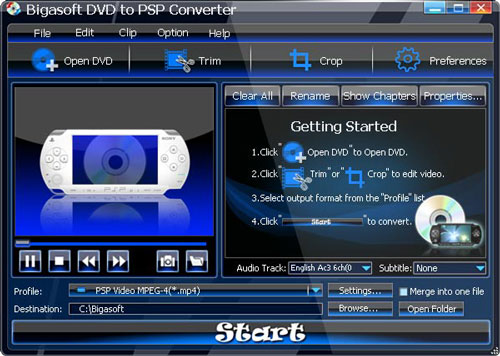 Bigasoft DVD to PSP Converter, phần mềm chuyển đổi DVD sang PSP chuyên nghiệp, được thiết kế đặc biệt để chuyển đổi đĩa DVD sang thiết bị PSP, PS3 và PS2 với tốc độ thực hiện nhanh cùng chất lượng file đầu ra tuyệt vời.