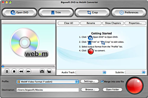 Bigasoft DVD to WebM Converter for Mac là phần mềm rip và chuyển đổi đĩa DVD đầu tiên dành cho WebM, giúp bạn có thể tạo WebM từ đĩa phim DVD trên hệ điều hành Mac OS X (WebM bao gồm video VP8 và audio Ogg Vorbis). Với phần mềm đơn giản, dễ sử dụng và chuyên nghiệp này, bạn có thể nhanh chóng rip và chuyển đổi DVD sang video WebM chất lượng cao, video WebM chuẩn hoặc video WebM độ phân giải thấp nhằm đáp ứng mọi nhu cầu của người dùng khi đăng tải lên các trang web hoặc video HTML5. Phần mềm này cunug cấp các chức năng chỉnh sửa tiên tiến để tùy biến video WebM đầu ra, như cắt kích cỡ video, cắt thời gian chạy video, nối video, tạo snapshot, xem trước,...