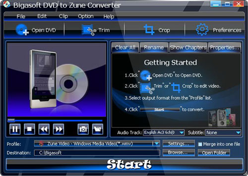 - Chạy đĩa DVD với Zune: Bigasoft DVD to Zune Converter giúp bạn mang bộ sưu tập đĩa DVD với thiết bị Microsoft Zune HD 32, Zune HD 16, Zune 120, Zune 80, Zune 16, Zune 8 và Zune 4.