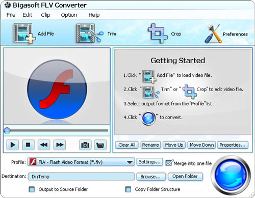 Bigasoft FLV Converter là cách tốt nhất để giúp bạn chuyển đổi FLV và video trực tuyến khác như video YouTube, MySpace,... để thưởng thức ở bất kì nơi nào. Phần mềm này có khả năng dễ dàng truyền video FLV sang các định dạng video phổ biến như AVI, Xvid, DivX, MP4, WMV, MOV, MPEG, MPG,... với chất lượng tuyệt vời.