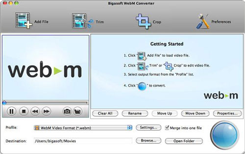 Là định dạng video mở, miễn phí, cung cấp chất lượng video không thấp hơn H.264 cũng như được hỗ trợ bởi rất nhiều trình duyệt, WebM thực sự tuyệt vời cho video HTML. Với hỗ trợ của Bigasoft WebM Converter for Mac, người dùng có thể dễ dàng và nhanh chóng tạo WebM, HD WebM và chuyển đổi các file video của bạn sang WebM từ bất kì định dạng video nào, bao gồm MP4, AVI, 3GP, FLV, MKV, H.264, RM, RMVB, VOB,SWF, Xvid, DivX, HD, AVCH, MTS, TS, WMV, M1V, M2V, MPG, DV.