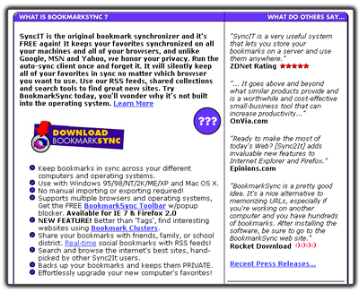 BookmarkSync là chương trình cho phép bạn đồng bộ các bookmark giữa các trình duyệt, truy cập vào chúng khi bạn rời đến máy khác và chia sẻ bookmark với người sử dụng khác.