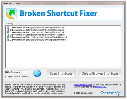 - Hoàn thành, nó sẽ hiển thị các shortcut bị hỏng trong cửa sổ chương trình. Bạn có thể nhấn nút Delete Broken Shortcuts để xóa những shortcut bị hỏng.