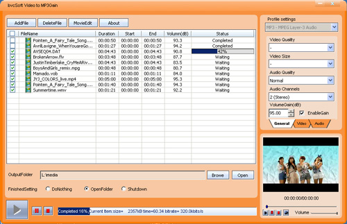 bvcsoft Video to MP3Gain là chương trình chuyển đổi MP3 chuyên nghiệp đơn giản hóa, bao gồm 2 phần mềm tốt nhất: video to MP3Gain Converter và audio to MP3Gain Converter. Ứng dụng này có thể trích xuất audio từ hầu hết các định dạng video phổ biến hiện nay như DivX, XviD, AVI, WMV, MPG, MPEG, MP4, M4V, H264 FLV, 3GP/3GP2, ASF, RM, RMVB, MOV, MOD, ASX, MKV, VOB, và PMP cùng với tất cả các định dạng audio như MP3, MP2, AAC, WAV, WMA, AC3, AU, M4A, AIFF, AMR, FLAC, OGG, và MKA. Tất cả sản phẩm đầu ra đều có chất lượng cao và được chuyển đổi trong thời gian nhanh nhất.