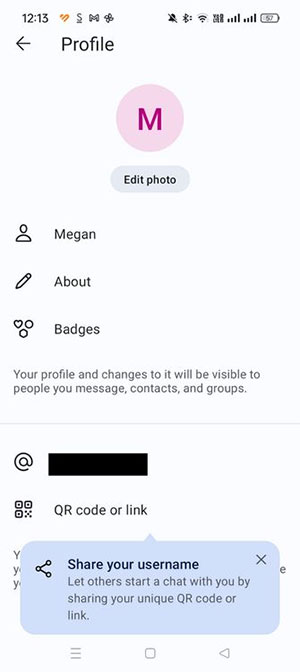 Signal sẽ gán một số cho tên người dùng và các tùy chọn chia sẻ mới sẽ hiển thị trên menu hồ sơ. Nhấn vào mã QR hoặc liên kết để chia sẻ tên người dùng của mình với người khác.