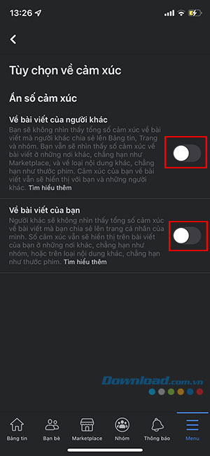 Bước 4: Chạm nút chuyển đổi để bật Ẩn số cảm xúc về bài viết của người khác hoặc bài viết của bạn.