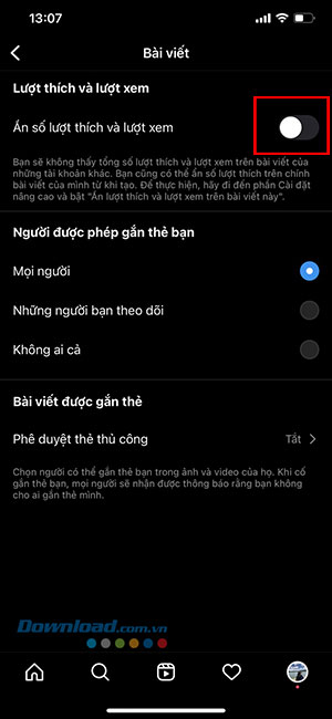 Bước 5: Chạm vào công tắc chuyển đổi để bật Ẩn số lượt thích và lượt xem.