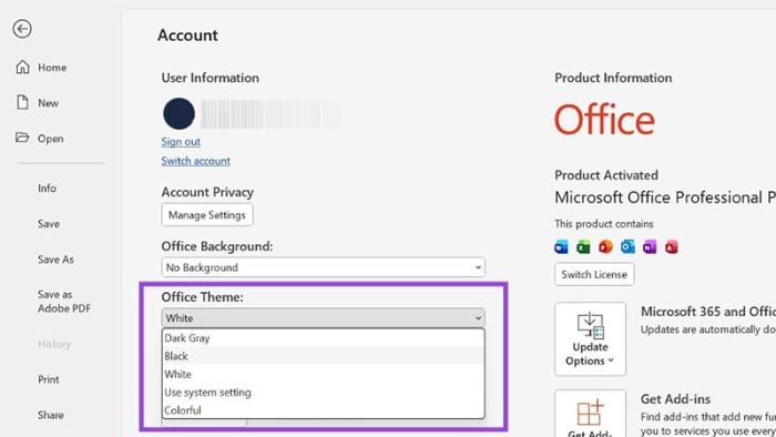 Đây là cách nhanh nhất để bật chế độ tối cho toàn bộ Office. Khi thay đổi trong một ứng dụng (ví dụ như Word), toàn bộ bộ Office (Excel, PowerPoint, Outlook,...) cũng sẽ tự động áp dụng.