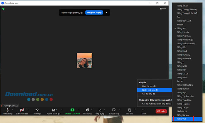 Bước 2: Nhấp vào Ngôn ngữ phụ đề và chọn Tiếng Việt để bật phụ đề tiếng Việt trong cuộc gọi Zoom. Mọi người cũng có thể chọn ngôn ngữ khác tùy theo loại ngôn ngữ mình thường dùng khi gọi Zoom.