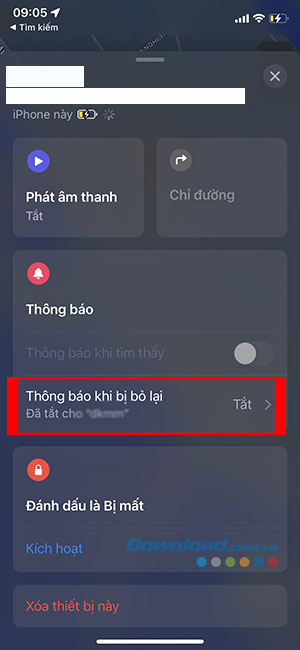 Bước 3: Thông tin về thiết bị đã chọn sẽ hiển thị. Cuộn xuống và chọn Thông báo khi bị bỏ lại trong mục Thông báo.