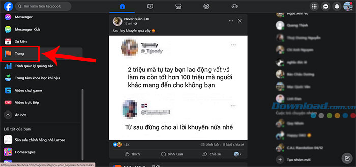 Bước 1: Truy cập Facebook trên trình duyệt web và chọn tab Trang ở bên trái. Nếu không nhìn thấy nó, hãy mở rộng menu Xem thêm và chọn tab Trang.